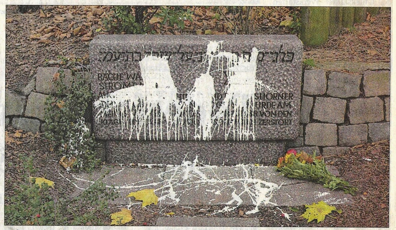 Vor 25 Jahren Anfang November 2000: Neofaschisten beschmierten den Gedenkstein für die Elmshorner Synagoge. Noch vor der Kranzniederlegung wurde damals der Stein wieder gesäubert. Bild: EN v. 10.11.2000